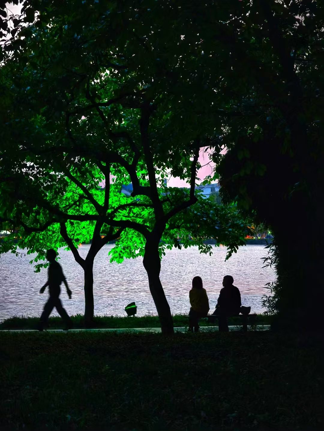 暮色渐浓,湖畔被静谧笼罩。树影在微光里摇曳,似在诉说着一天的故事。走湖人脚步轻松,消化着一天劳作后的疲劳;而长椅上的两人,偷得浮生半日闲,于这湖光树影间,静静享受着属于他们的悠然时光。