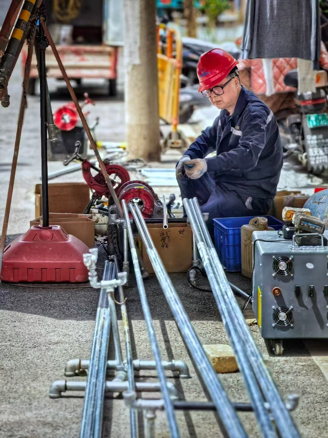 烈日下的小区里,管道作业人员专注地操作各种器具,进行安装前的加工。身旁是排列的金属管道、各式工具,看似杂乱却有序。他在平凡岗位上,以汗水与专注诠释劳动价值,每一次操作,都是对责任的坚守,为城市建设添砖加瓦。
