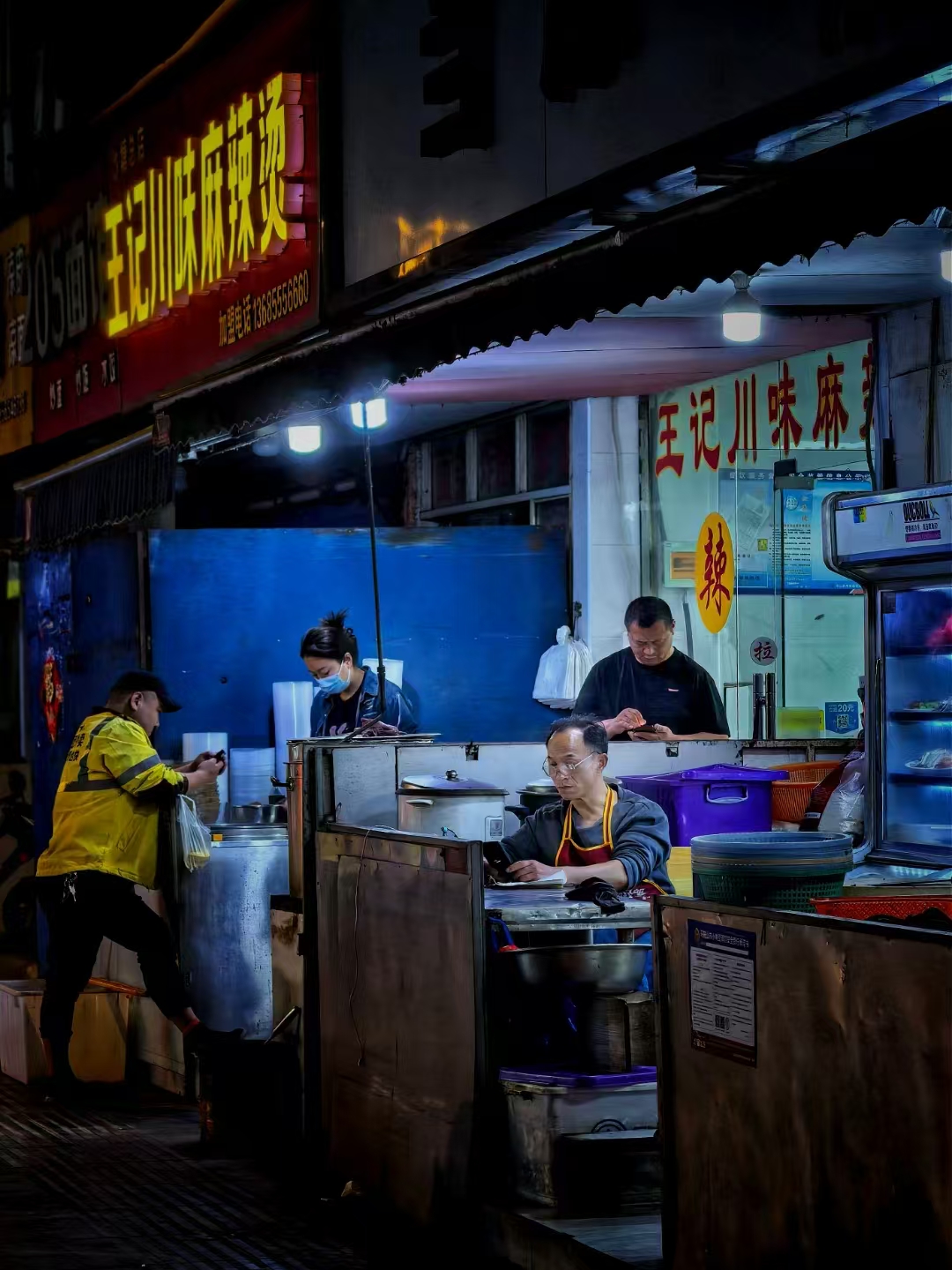 夜已深,街边麻辣烫店前,暖黄灯光交织着烟火。摊主们忙碌又从容,有人在整理食材,有人在查看订单。外卖小哥脚步匆匆,带着热乎的期待奔赴下一站。这一方小小天地,盛满了生活的热辣与温暖,在夜色中慰藉着每一个归人。
