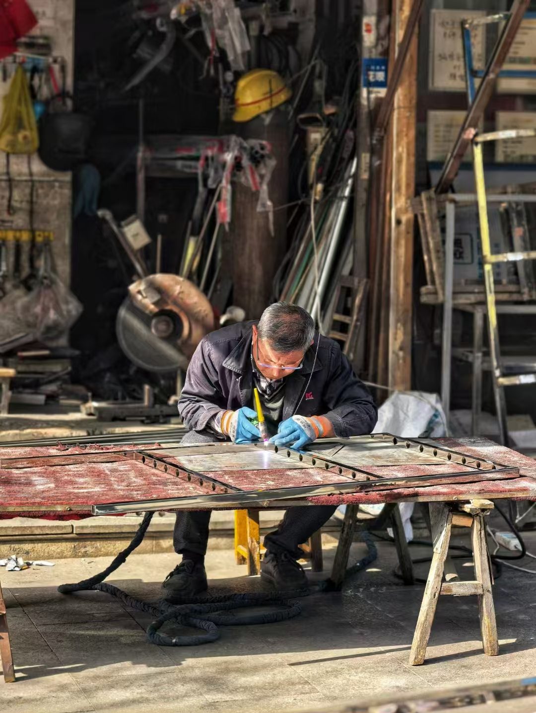街头略显杂乱的工坊里,一位师傅带着护目镜和手套专注地操作着氩弧焊,细心地进行不锈钢焊接作业。岁月或许染白了他的头发,但专注与匠心从未褪色,每一个火花飞溅,都是他对技艺的坚守,对生活的热忱。