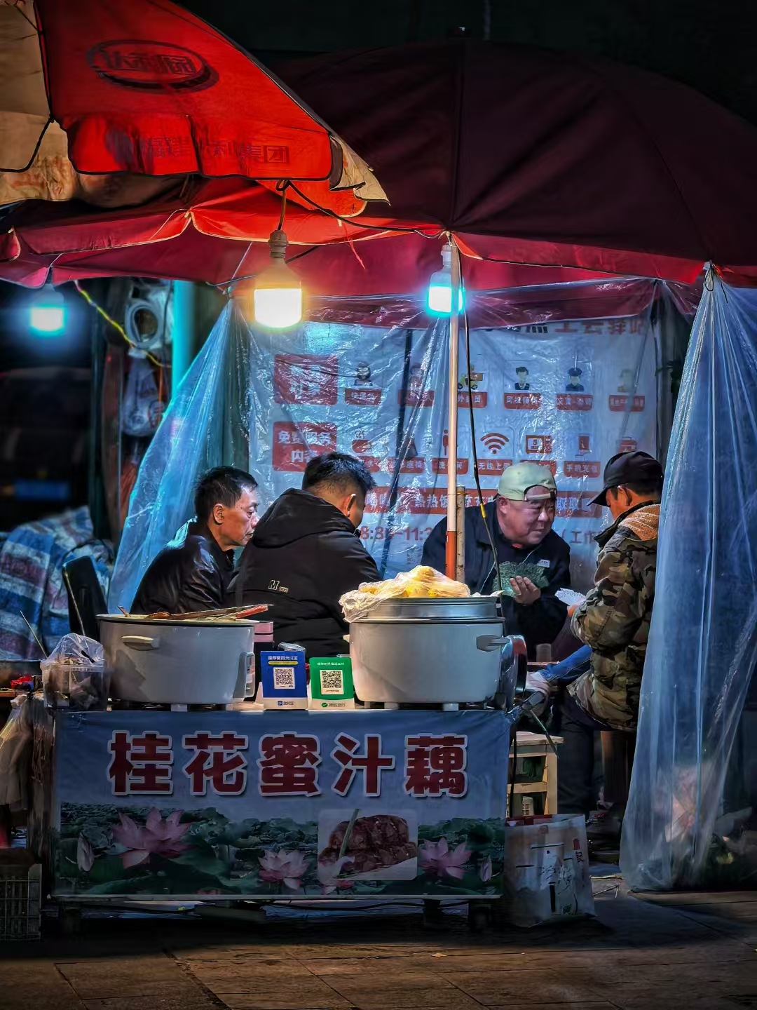 夜色中,街边的小吃摊依然亮着暖灯。摊主与几位朋友围坐,在简易的棚子下掼蛋聊天。这一方小小的天地,装满了生活的烟火气,虽然没有精致的装潢,但有着最纯粹的温暖与惬意,每一口美食都裹着平凡日子里的甜。