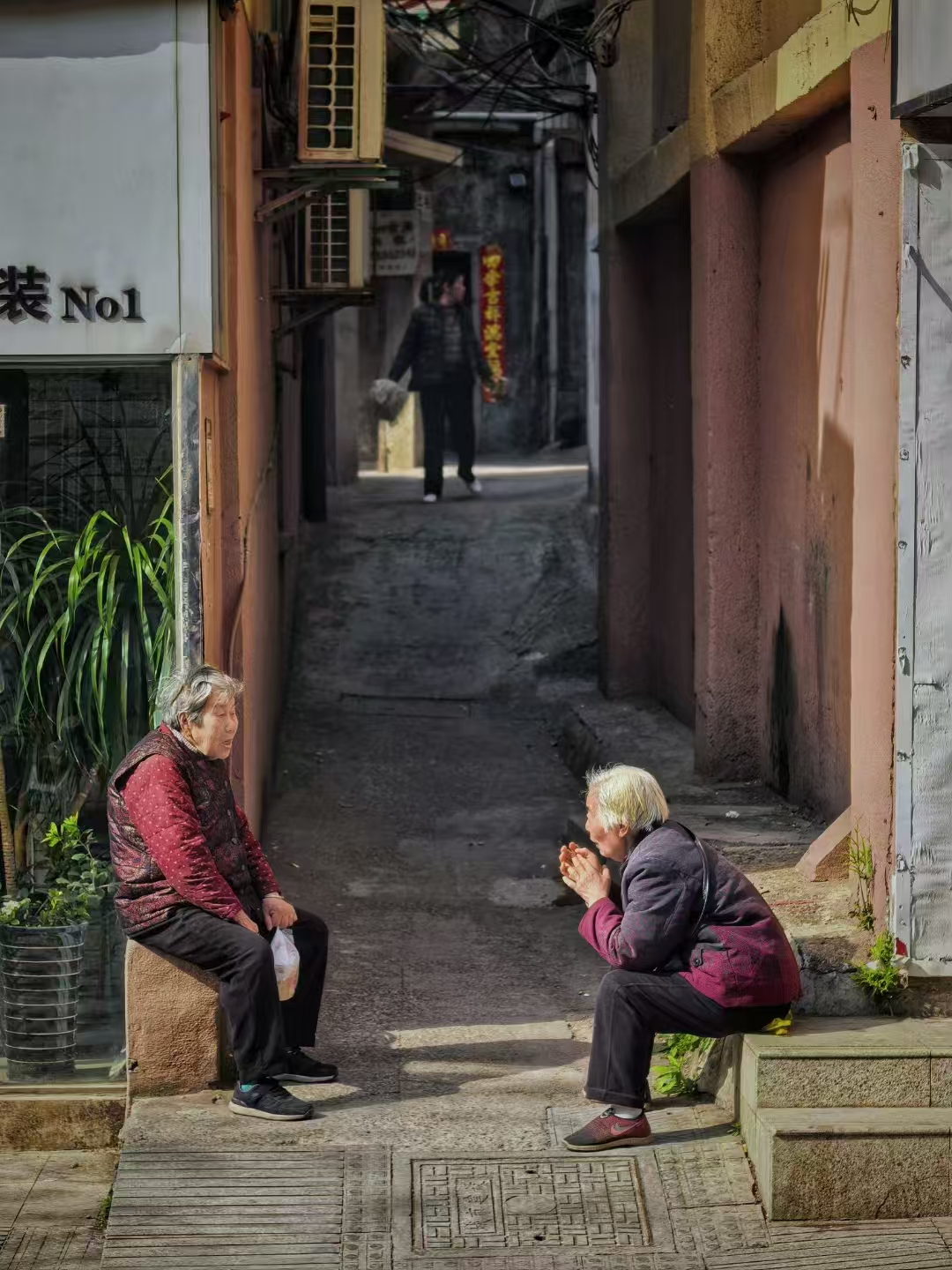 在城市略旧的小巷,阳光漏下斑驳光影。两位老人静静坐着,无需太多言语。岁月似在这一刻慢下脚步,往昔回忆如巷中绿植,在时光里悄然生长。她们守着这方宁静,守着彼此相伴的温暖日常。