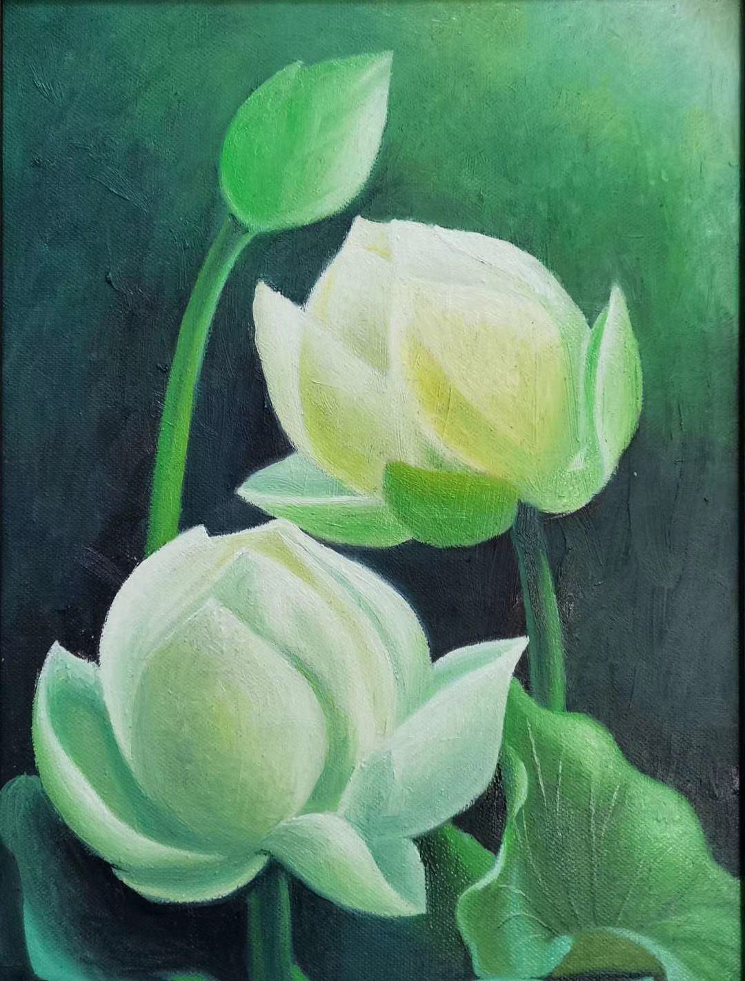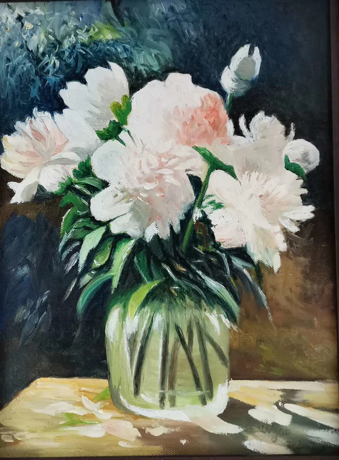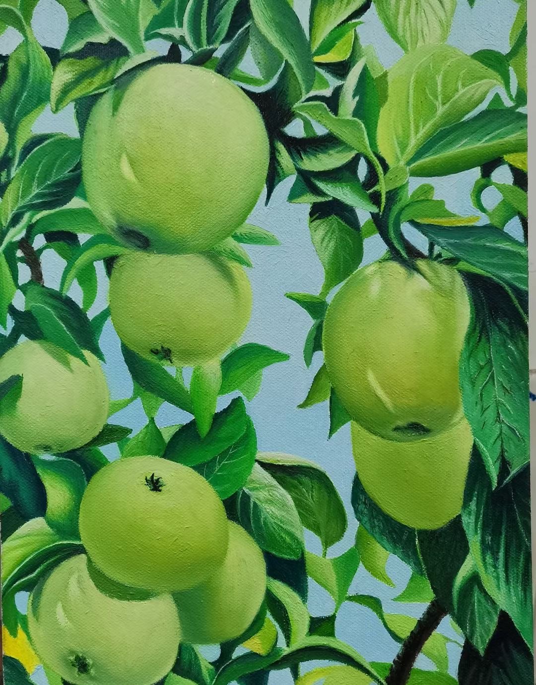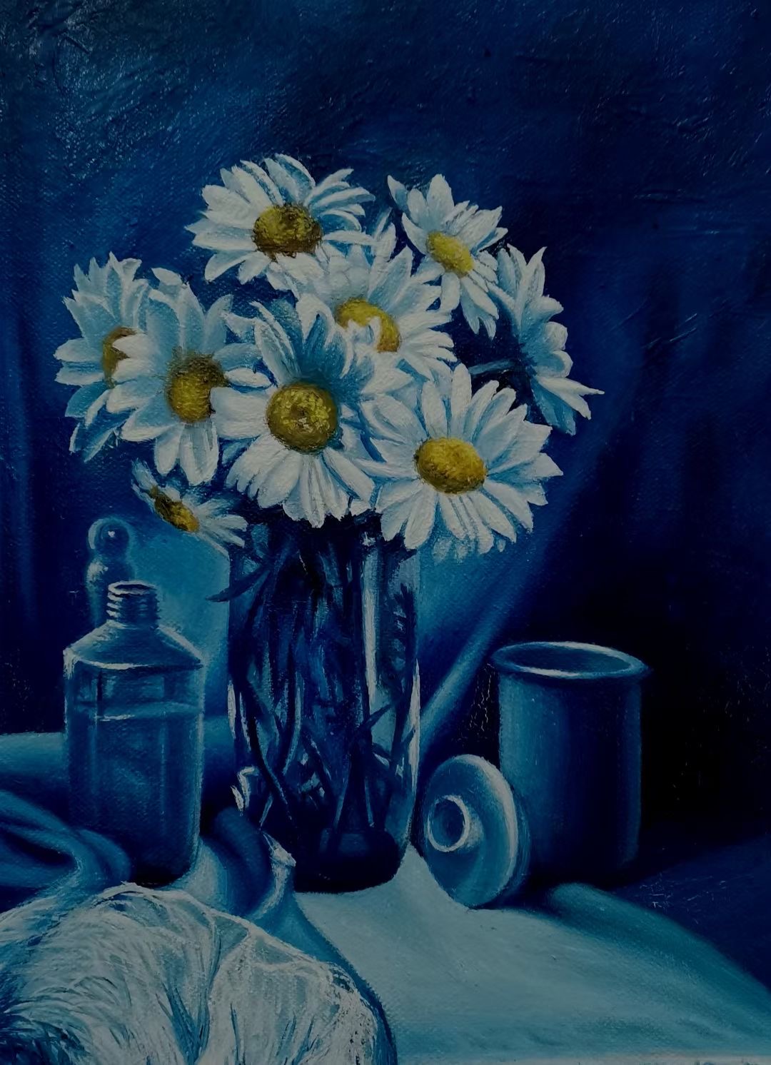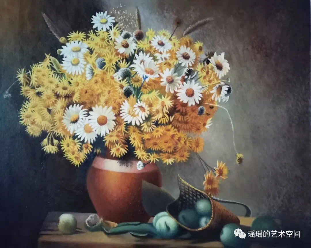 这幅静物画,再进行几层色彩处理就画好了。黄色是难画岀效果的,要比其它的颜色多画好多层才能呈现岀想要的色彩。虽是对色彩使用的学习,也能有很多对用色的感觉,色彩的使用次数或厚度不够,油的挥发成度不同,在重复用色时的效果也是不同的。其实,要想达到理想的色彩效果还是很难的。不过,绘画中能达到接近色的效果就祘不错了。当然,只有在学习过程中去追求最佳结果的态度才是可取的。
