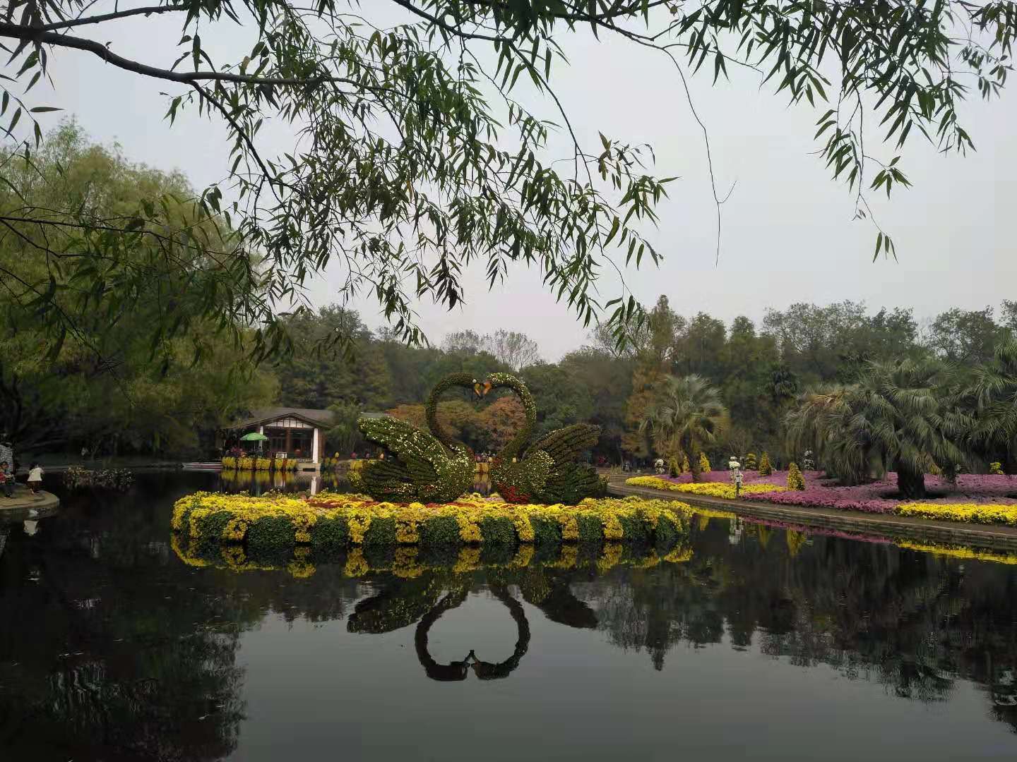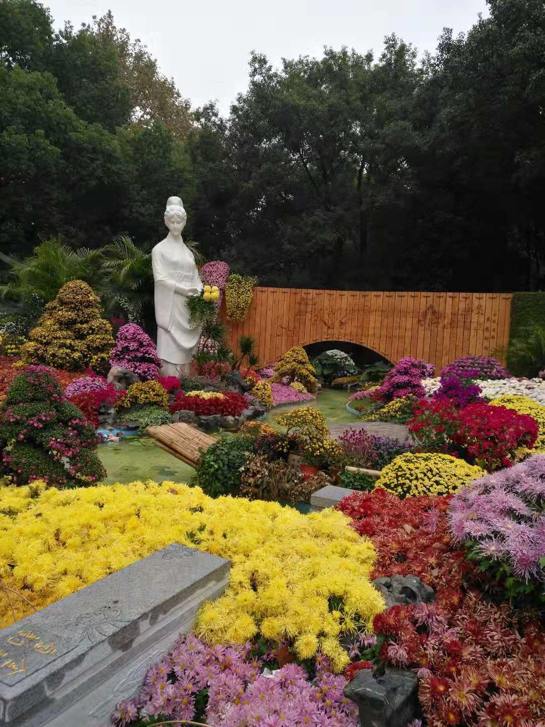 平复心情的我来到了金陵菊韵.莫愁烟雨的景点,以纯粹的菊花作为基调,以莫愁女构建空间的骨架,以自然山水画为背景格局,以莫愁湖的湖水明秀,垂柳依依为美景,展现了意境唯美的国画。站在这幅画前,我想起了莫愁女《阳春白雪》的千古绝唱,也浮现出一周前去游历南京城,看到她的繁华和她的美丽。