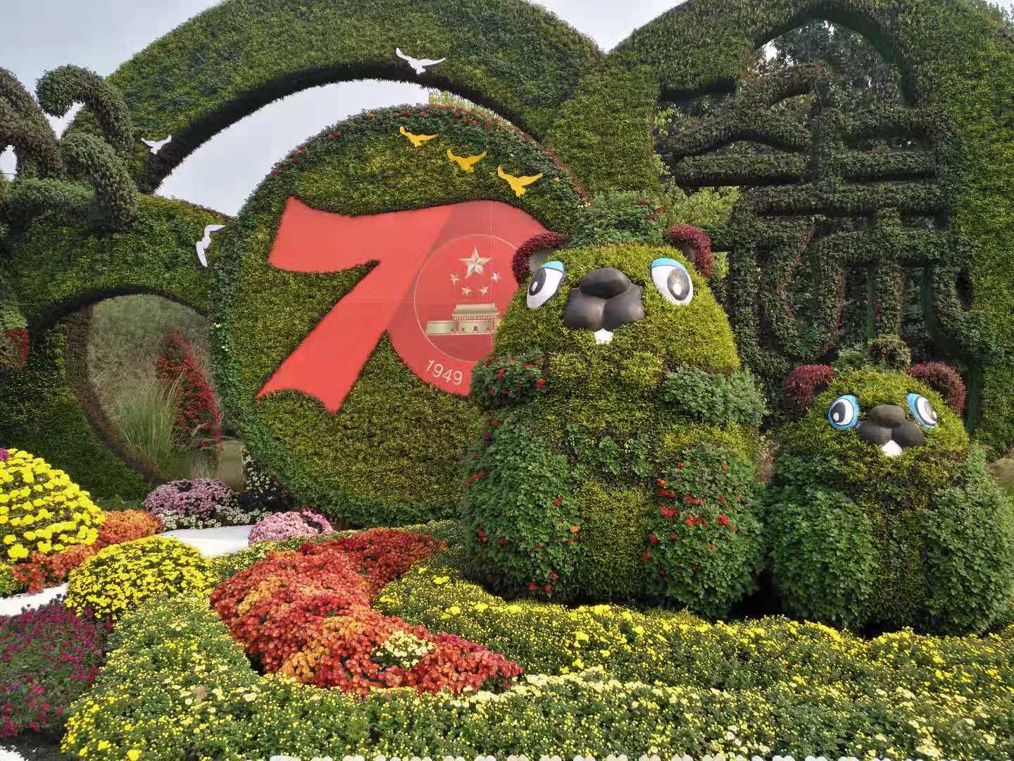 这是一幅菊花为主题的锦绣山河图,二个巨大的绿色圆,一个红色的70数字,二个有菊花点缀的河狸宝宝,几个菊花宝塔及铁艺菊花元素构成了新中国成立七十周年的图案。70年来祖国发生了翻天覆地变化,人民的生活有了很大地提高,祖国处处是锦绣河山。