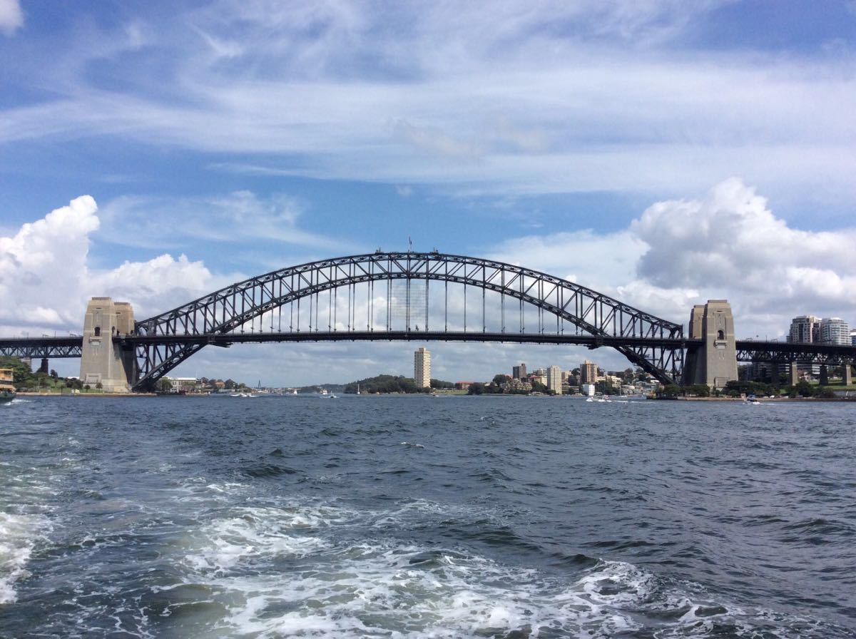 傍晚时分,我们乘游轮游览了悉尼海港(又称达令港),从悉尼大桥下穿越,该桥是迄今为止世界上跨度最长的单拱钢卯铁路桥,桥龄已近百年,雄姿依旧。桥下可以远眺著名的悉尼歌剧院。