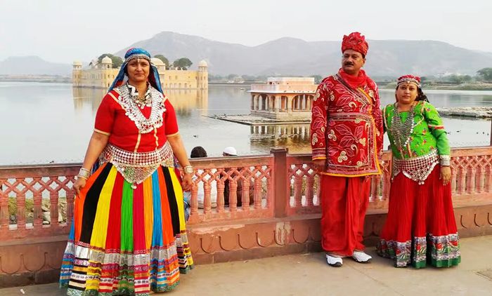 从虎珀堡下来,天色已晚,司机拉我们去酒店,路上有一座著名的水上宫殿映入眼帘。它是16世纪斋普尔君主为避暑,命人在人工湖中兴建的。这是一座建在水中的皇宫,只有乘船才能到达。宫殿本身不对外开放,里面是什么设施我们没有看到,但在湖边远眺,奶白色的宫殿如同漂浮在水面上一般,很是漂亮。湖边有许多游客,还有卖东西的小商贩。我看见有的印度人打扮成国王和皇后样子拍照,挺像模像样的。有一个胖胖的女子,看见我拍她,马上摆POSS配合我,很可爱的样子。