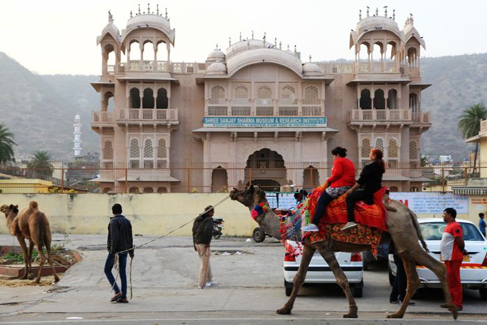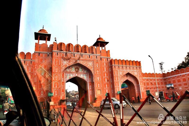 印度不仅服饰多彩,连建筑都是多彩的。这些色彩勾勒了城市风貌,镶嵌在印度人的基因中,融入世俗生活里,形成了独特的视觉感受。我们印度行的第二站——斋普尔就是这样一座极具色彩的城市。斋普尔有个很诗意的名称“红粉之城”,也称之“玫瑰之城”。听袜子说这样的城市印度有四座:“蓝、白、粉、金”,叫四色之城。可惜我们只游览了红粉之城——斋普尔。