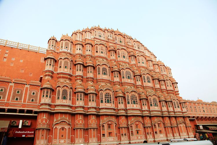 到的马路对面观看,取景角度还是不理想,无奈凑合拍了几张。这座宫殿是斋普尔地标建筑,我仔细观察,整个建筑由许多蜂巢式的小格子窗组成,后来看资料共有953个窗子。这些窗子后面,是古代印度妃嫔的血泪史。听说每个窗里住着一名妃子,这些妃子没有自由,终年关在屋里。她们之间互不相识。要想了解外面的世界,只能通过这面小小的窗口。外面的世界很精彩,可惜与妃嫔们无关。看着这些窗户,怜悯之心油然而生,这是古代印度妇女的悲哀。