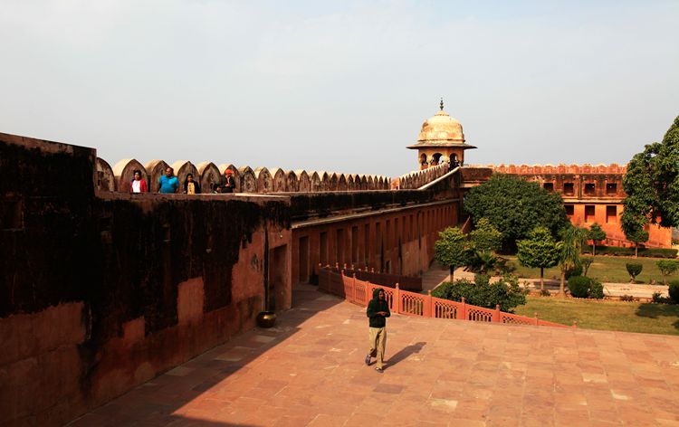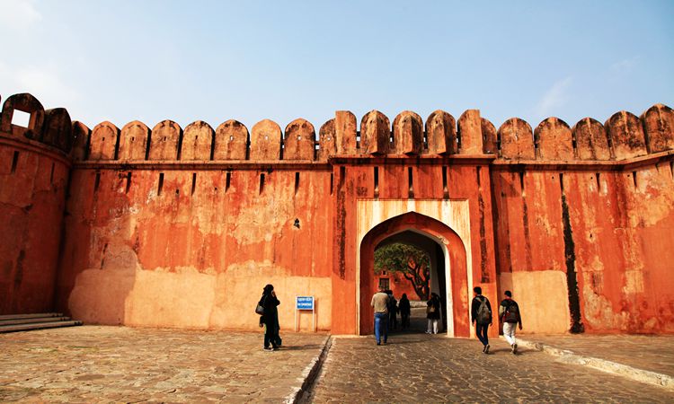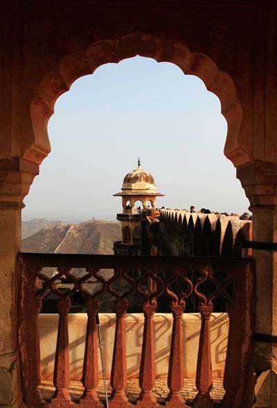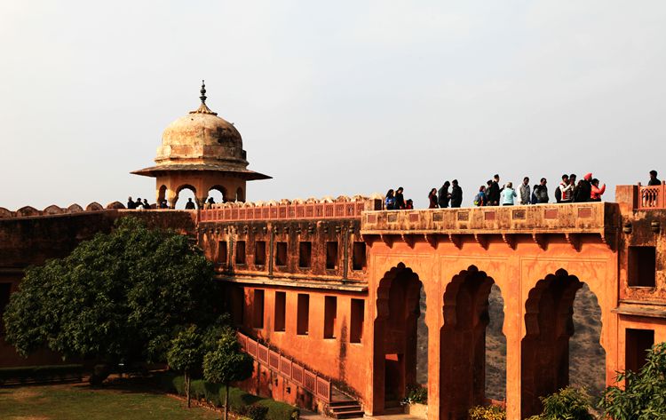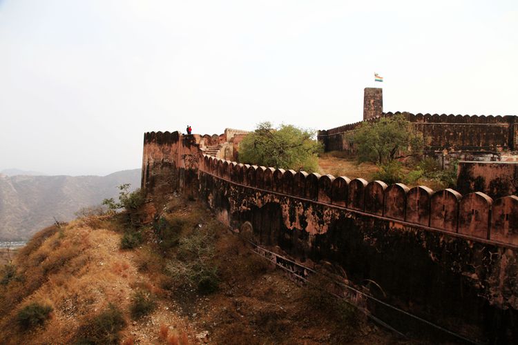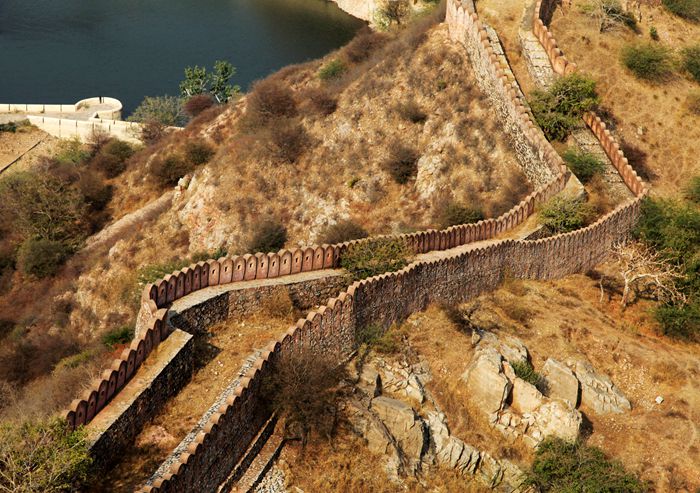 在斋普尔还有一个必去的景点杰加尔古堡。它座落在琥珀堡的上方。当车沿着蜿蜒的山跟驶向杰加尔古堡时,山下的琥珀堡尽收眼底。原来我们以为琥珀堡已十分险要了,没想到杰加尔堡垒更险要。这座城堡雄踞山巅,周围连绵的城墙长达70公里,它的防御几乎毫无破绽,既使当年它的敌人派出最强大的大象战团和骆驼战队,要想攻入这座城堡,也是痴心妄想。所以杰加尔堡被印度人称作“胜利之堡”。因为自从它建成后一千多年就从未被攻克过。