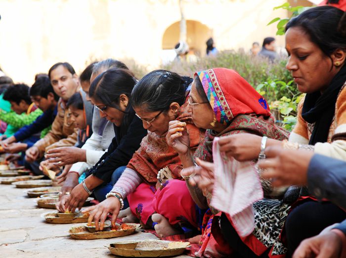 与杰加尔堡相反的方向有一座叫虎堡的寺庙,我们赶的真巧,来的时候,寺庙里正在举行祭祀活动,如过节一般热闹,我们脱离了鞋走进院子里,在墙边过道上有许多花花绿绿的人,我观察了一下有印度人,也有游客等。庙里有人在诵经,后院则支着两口大锅油烟滚滚,我看了锅里在炸素丸子,还有好多吃的东西摆在地下。