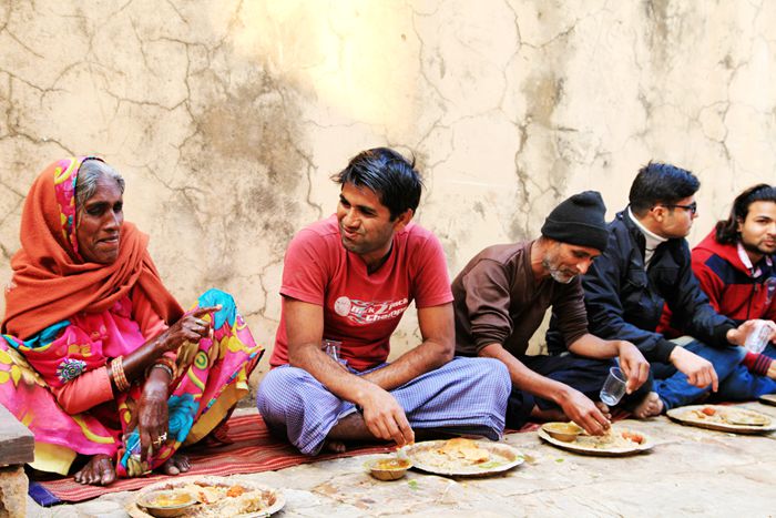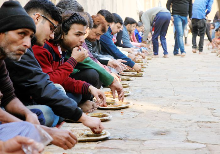 这些印度人非常好客,看我们进来,好几个上前打招呼,还有那些印度小孩也凑过来拍照。我看着锅里新炸的丸子很香,觉得刚出锅的东西不脏,我比划问他们能否尝一尝?人家听不懂,猫咪就用英文翻译,印度人听了,马上领我们到那一群人坐的地方,并在地上铺了一块毯子,随后拿来一个盘子给我们。我一看周围坐的人,都在等待食品的。我们不懂这里的规距,也不知道寺庙搞的甚活动,反正就是想体验一下当地风俗,也就入乡随俗和大家一同等待。