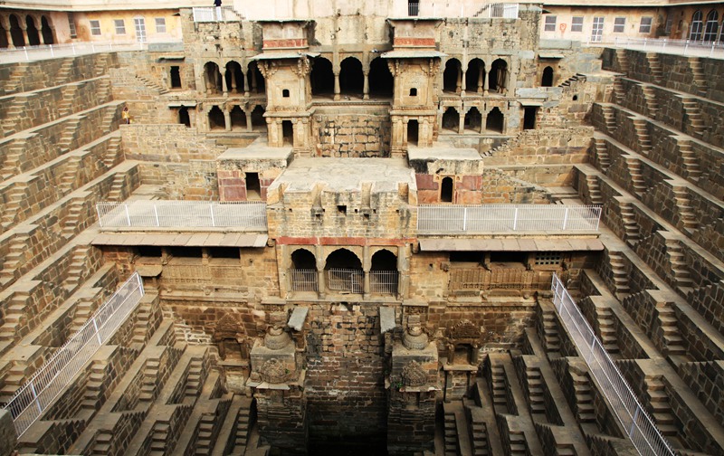 阶梯水井规模不是很大,它的形状象一个倒挂插入地下的金字塔。两面是复杂对称的阶梯,四面环绕沟通,由上而下由宽变窄,很是特别。据说这是拉贾邦最大的月亮水井,光阶梯就有3500个。井中间是一座寺庙,里面供的是什么神仙不知道,只看见有个印度妇女在磕头祈祷。(待续)