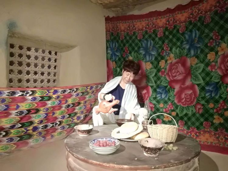 走出这座建筑,我们又步行一段,走近又一道交河古城的检票口,它是一座较小的仿维族民居的两层建筑,不知何因,它正面上层的墙壁上却又嵌上了“交河古村”四个字。进入以后,底层是模拟的一些古残垣断壁,上层分出许多小间来,一部分陈列了一些维族农具、猎具和一些民族服饰,一部分模拟陈设了维族人生活的场景。这里有好几位男女警察,检查非常严格,“三角梅”试图拍下一张检票口的照片,被一位警察阻止。