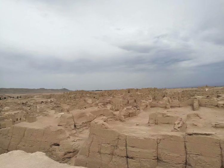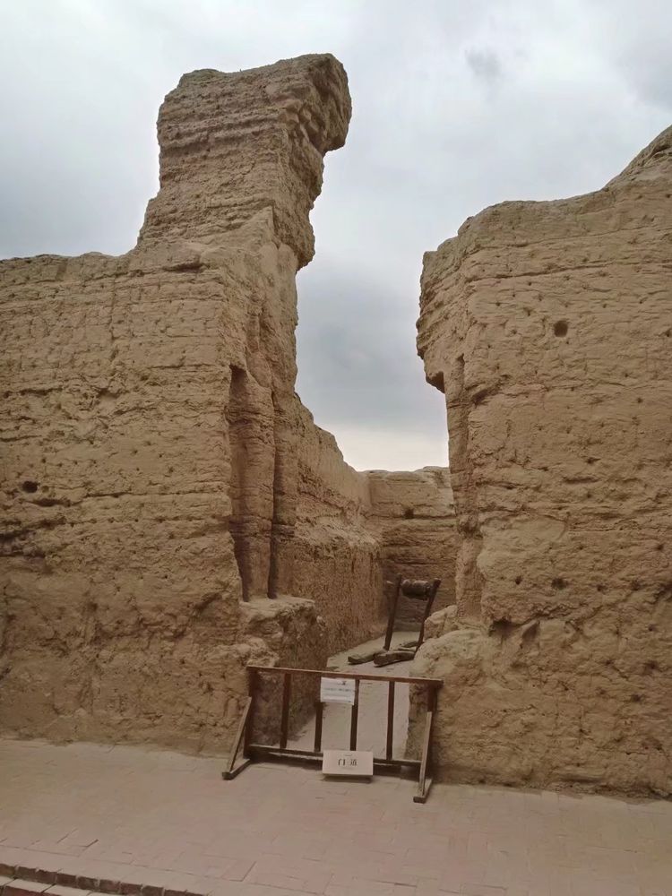 走出这些“官署”,干涩的热风吹得鼻腔也有些涩感。我们继续向南行进,两侧看到的仍是一些残垣断壁,那位维族姑娘指着左侧一处低凹地,告诉我们那里曾经是小孩的墓地。当我们正欲向南行进时,一条深而宽的壕沟横亘于我们面前。维族姑娘告诉我们,沟的那面是居民区。放眼看去,又是一大片残垣断壁,但那里比我们的脚下明显地低下许多。那位维族姑娘还告诉我们,这里因里常年不降雨雪,古城才得以有现在这个样子。是啊,我不禁感叹,大自然自有它的神奇之处,如若经常雨雪,也不会有这个遗址的存在,我们也绝不会涉足于这里的。