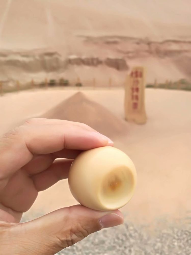 此时,尽管天空阴云笼罩,但气温还是渐渐上升起来。打开车窗,吹面风涩;关上车窗,顿感闷热。但总体上还能承受。一会儿车子转行进入一段山路,我发现路左边有人坐一柴棚下,原来他是在棚边堆了一堆沙子用沙子吸收的太阳热能烤鸡蛋买,沙堆上还俨然树了个“吐鲁番烤鸡蛋”的牌子。我便请司机稍停一下,下车直奔那个沙堆走去。走近拨开沙子一看,那里面果然埋了许多鸡蛋。之后我走近棚下那位男子,问鸡蛋可食不?回答说可食。我便欣然买下一只,既饱了眼福又饱了口福,还留下一张自拍。