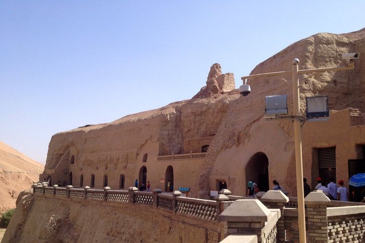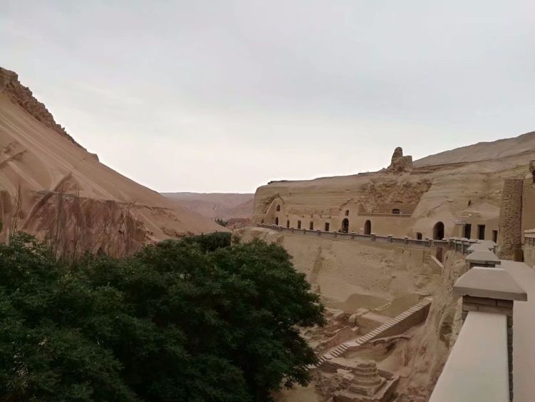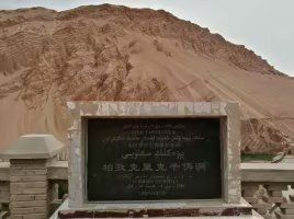 我们赶到这里时恰好有一旅团来,便随着他们参观了三五个洞窟,这些洞窟里的壁画和塑佛大多已遭人为破坏,保存壁画据介绍总面积一千二百平方米,实际上已经很不完整。大多数比较有价值的已被一名叫勒柯克的德国人于二十世纪初盗运到了柏林。因此那位导游的介绍也没有引起我们多大的兴趣。