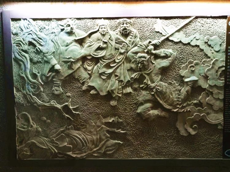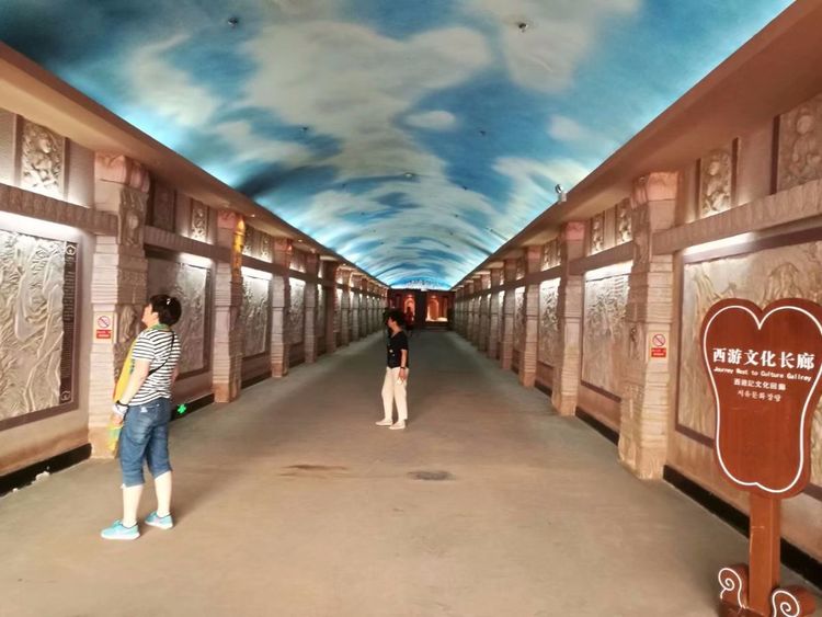 借山兴景,在那儿兴建了一些人文景观。游人远远即可看到一根“电线杆”高高地矗立在路边,当我们的车在路边停下时,才知道那就是《西游记》中孙悟空从龙王那里讨来的可大可小的 “定海神针”,但它又被赋予温度计的功能,下车后为它拍照时,我们看到当时显示的读数是四十三度。它的基座处在三四米深的地下,要下十几级台阶方可走近。开发者很用心,围绕着这根“定海神针”,在地下修建出上百间不小的房屋来。这些房屋,一半被用作文化展示,其中在我们进入这座建筑的地下长廊还被取名为“西游文化长廊”,艺术家们借用《西游记》中唐三藏西天取经的故事,刻画出一些栩栩如生的石雕被镶嵌在廊壁上,长廊的拱顶上又被配置成光电制成的蓝天白云,使人有处在空中之感。