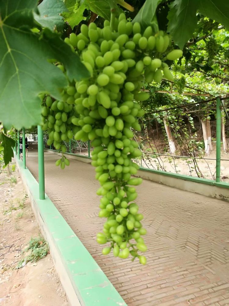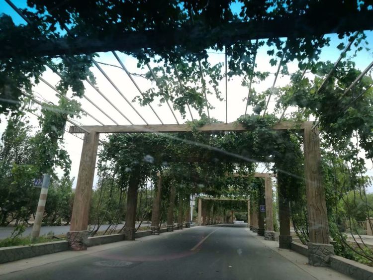 这里树木葱笼,阡陌交通,温度适宜,清静幽雅游人极少,看着让人顿生留恋之意。浓荫遮蔽下的平坦道路自然引人入胜。我们就在这路的导引下进入一条条观光葡萄长廊,有的长廊里,枝叶扶疏,果实高挂,疏影横斜,暗香浮动。有的长廊里,葡枝初起,果实满枝,晶莹剔透,随手可及。我们还走过一段上方搭了草帘的木板栈桥,走在上面的倍感自在。有一些廊道上方,还悬挂了一些木板,上面教人如何说日常维语,如果有兴趣,你还可学着说几句。这一切均让人有忘我之感。如果你是一个阳光的人,你自然会被这自然的也是人为的景观所打动,忘却生活中的一切烦忧和不快。