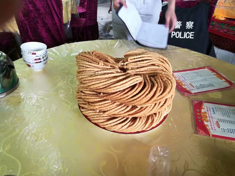 葡萄沟景区葡萄架下绿色餐厅里供游客免费品尝的美食——馓子