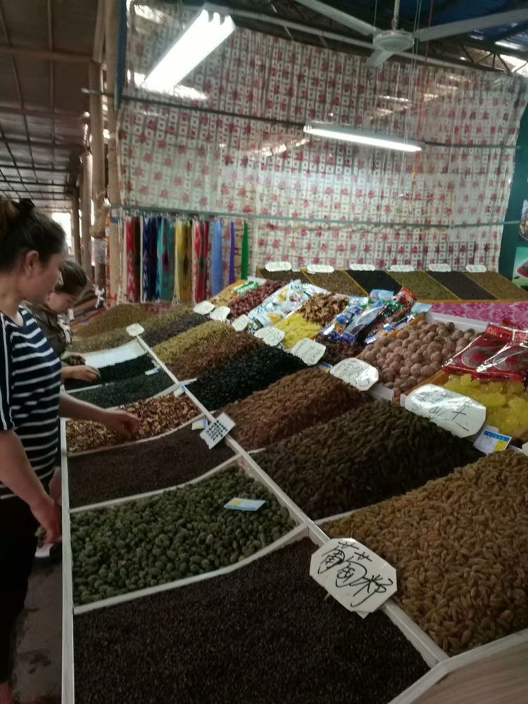 饭后我们继续向里走去。走过几个这样的葡萄棚架后,路的两边则是一些商铺,主要经营一些葡萄干、杏干和核桃之类干果。我们随意地转游着。当走进一家装潢好灯光比较亮的店铺时,我看见有葡萄籽卖,便问了一下,女老板说二百元一斤。我想能将葡萄籽分离出来也不易,这价位也合适。但当我们走至这一排店面尽头,问一店老板时,却是二十元一斤,方知前面那位女老板心太黑。看来买东西还是多问几家好。
