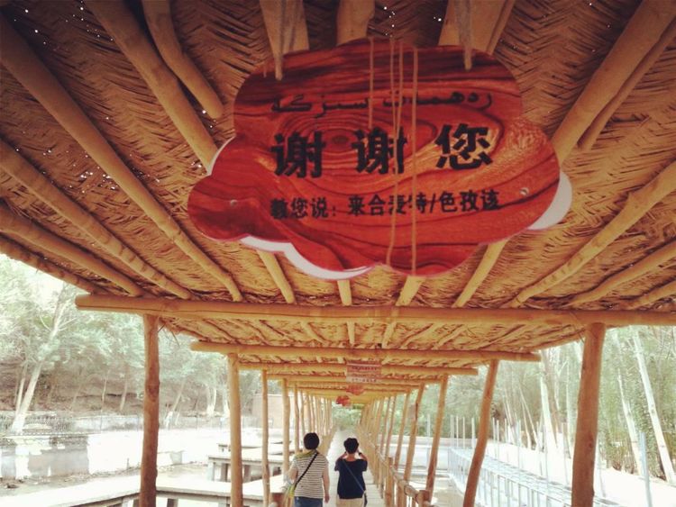 葡萄沟中的木制栈桥,“谢谢您”上方是维语,下方是汉语注音,有功夫,可以学说维语