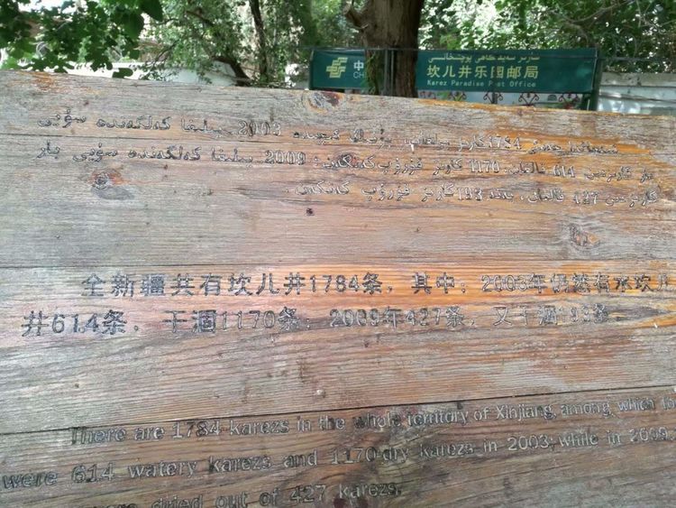 坎儿井普遍于吐鲁番地区。据有关介绍,坎儿井与万里长城、京杭大运河并称为中国古代三大工程。景区一块木牌上介绍,全疆有坎儿井总数一千一百八十四条,而吐鲁番就有达一千一百多条。全长约五千公里。二零零三年时,仍然有水的坎儿井六百一十四条,二零零九年时有水坎儿井仅剩四百二十七条。