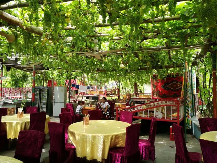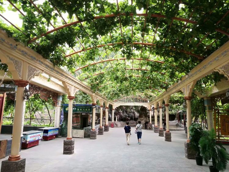 游人很少。一两分钟后,我们来到了无处不葡萄的葡萄沟。我们面前直行的路两侧是一座座宽大的、布满葡萄秧挂满葡萄串的葡萄架,琳琅满目的葡萄,清脆欲滴,既令人眼花缭乱,也令人心旷神怡。当然也令人顿生食欲,可惜的是葡萄未熟。但仔细一看,这些葡萄架下却置满了餐饮所需的一切,你不仅恍然大悟——这一座座葡萄棚架,就是一家家餐饮店,这棚架的主人就是餐饮店的大老板。我们在左侧一棚下餐桌前坐了下来——我们确实需要吃一顿迟来的午餐了。主人首先为我们端上来一盘金灿灿的馓子,说是免费品尝的,饥饿感已很强的我们随意掐了几截吃了,还真不错。之后我们点了拉面和砂锅羊腿上来吃过,也觉很香。很值得一说的,是那一盘拉面,如觉得面不够,还可以再加,显示出新疆人的豪放和大度。当然价钱也不菲,相当于内地五碗兰州牛肉面的价钱。