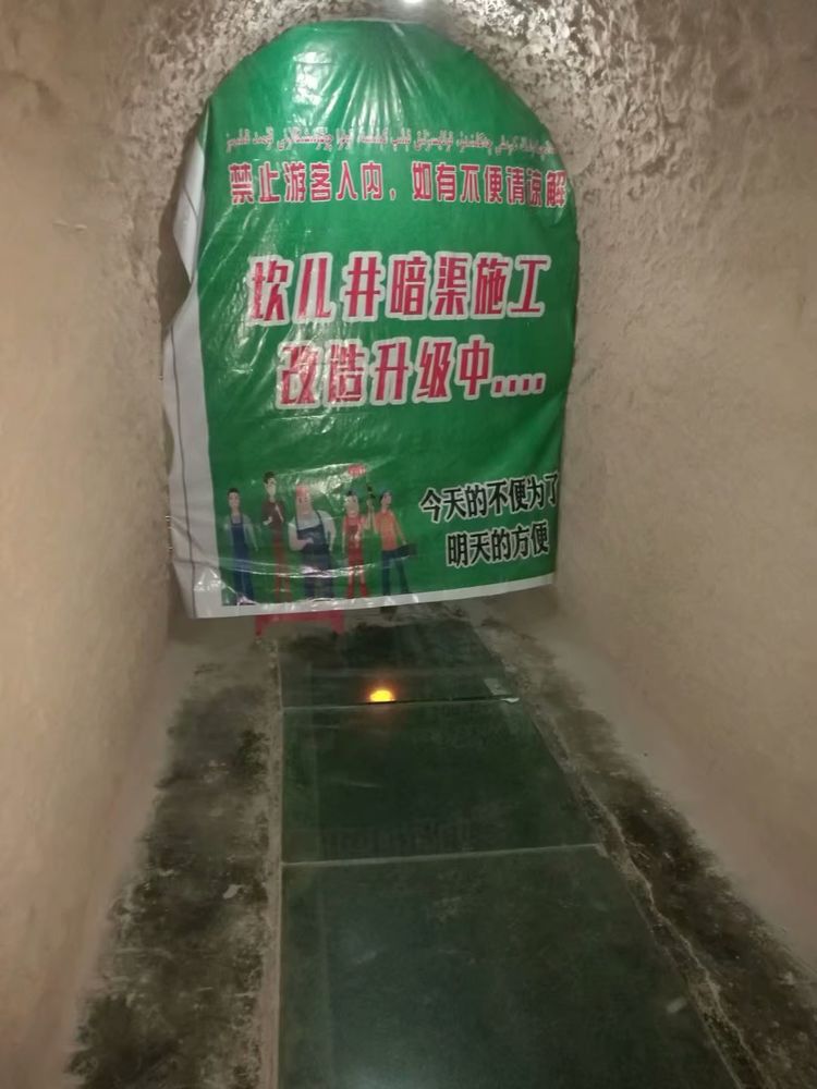 当我们走入与入口相对的一道门时,才发现我们脚下踩的是厚厚的浅绿色玻璃,玻璃下面有着悠悠流水。我不禁暗暗赞叹起景点的开发者来——他们多有智慧呀。沿着这条玻璃踏一直走,才发现我们已进入《地道战》中那样的地道了。地道曲里拐弯,凉爽可人。走着走着,发现走不动了,前面挂一牌:“坎儿井暗渠施工改造升级中……”由是我们知道,这些都是新开发用来观光的坎儿井。今人在利用古人的智慧,靠开撖新坎儿井挣游人钱了。