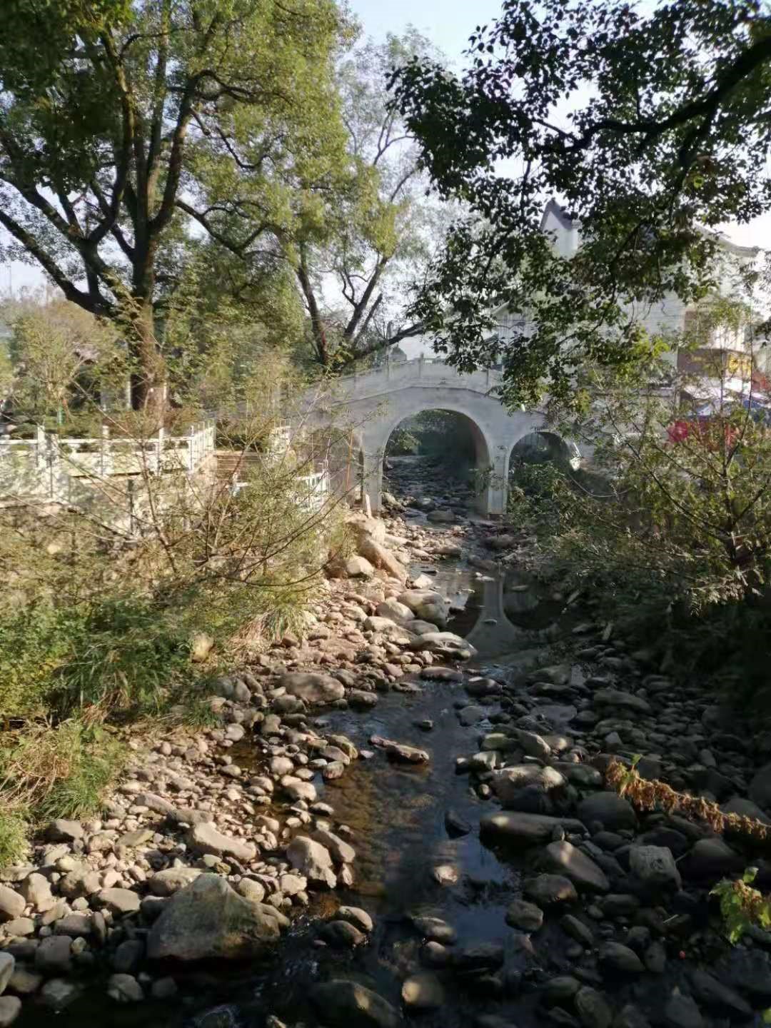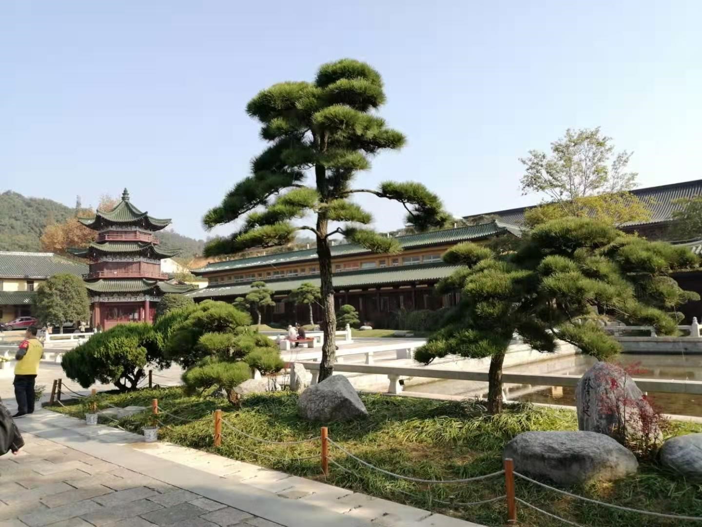 山门前溪谷中的潺潺流水,天然铺陈在流水中的圆润卵石,凌驾于溪谷之上的飞虹形石桥;进得山门,尽是平整的大块麻石铺就的广场及路面,配于石雕栏或木围栏,池塘中依稀可见的游鱼及因季节而近枯萎的睡莲,小桥,半月门,曲廊,高大的方木质葡萄藤架,宽敞石阶,石阶平台旁刻意安放的靠背长椅;还有各种花坛,及随处可见的花卉盆栽,品种繁多的植树,绿色的草地,一路走来,可圈可点的美景真叫人目不暇接。