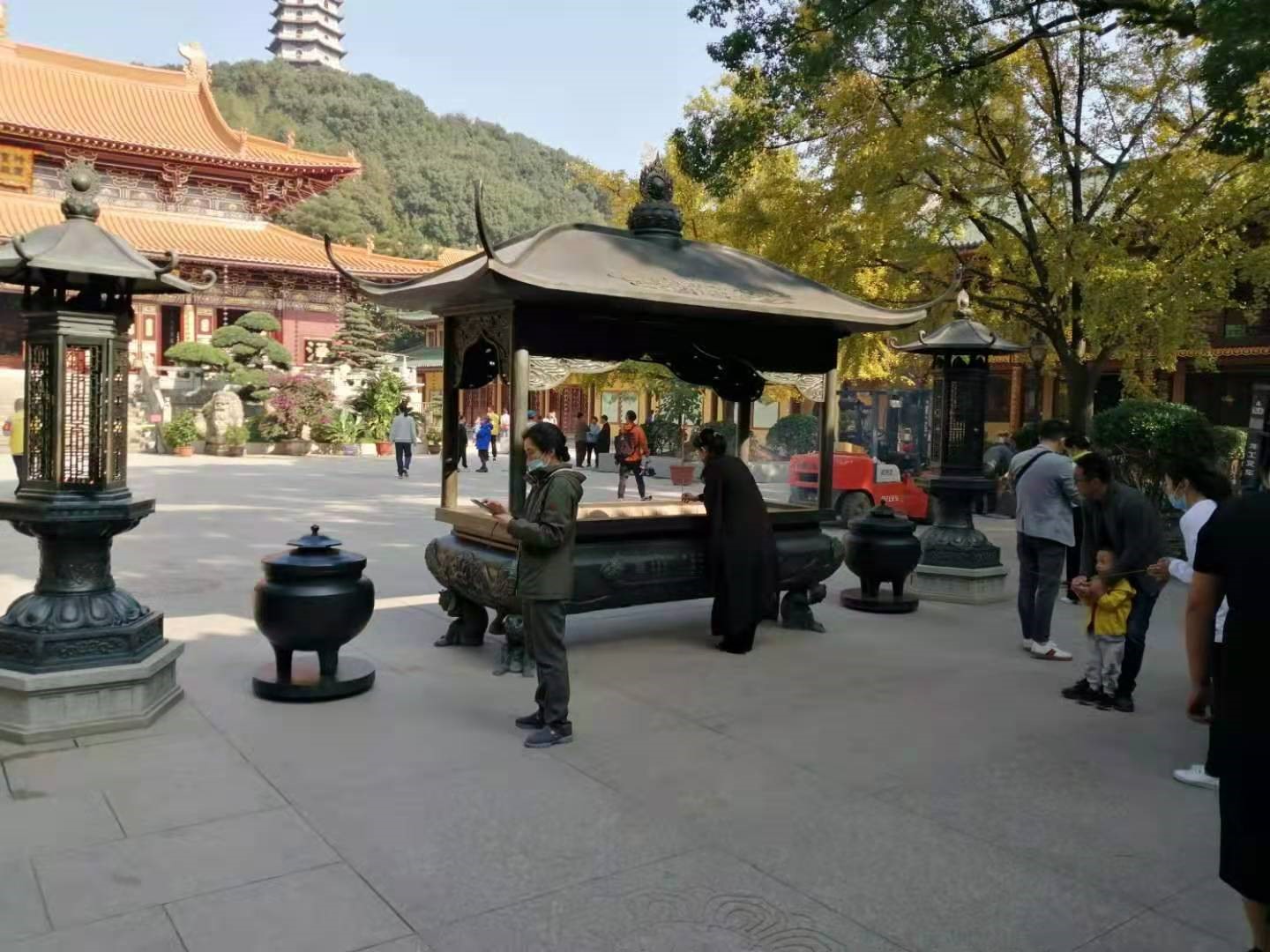 我们要参加的法事是安排在第二天下午的3:40举行,参加的人员必须提前2O分钟进入大雄宝殿。第二天下午,我们如约而至。参加做法事的家庭,不管来了多少家人,都只发了一张卡,只许一人进入大雄宝殿。韦本想要参加的,但听说整个活动时长90分钟,中间又会有频繁的跪与起,自已膝关节又不太好,决定还是由我参加。我一穿上海靑杉,就感觉自己的一举手一投足,自然有了些古人的韵味,我知道这些动作都是给这衣服逼出来的。