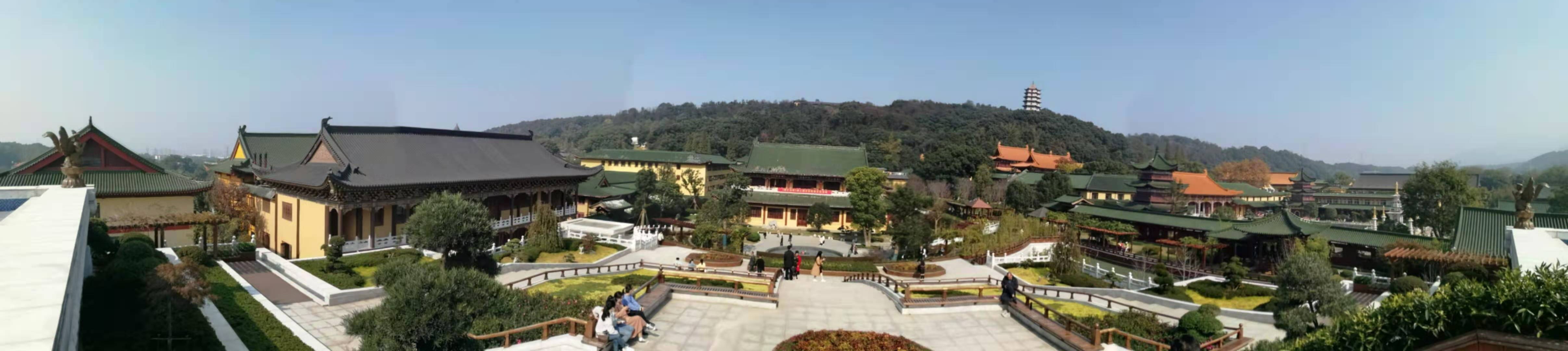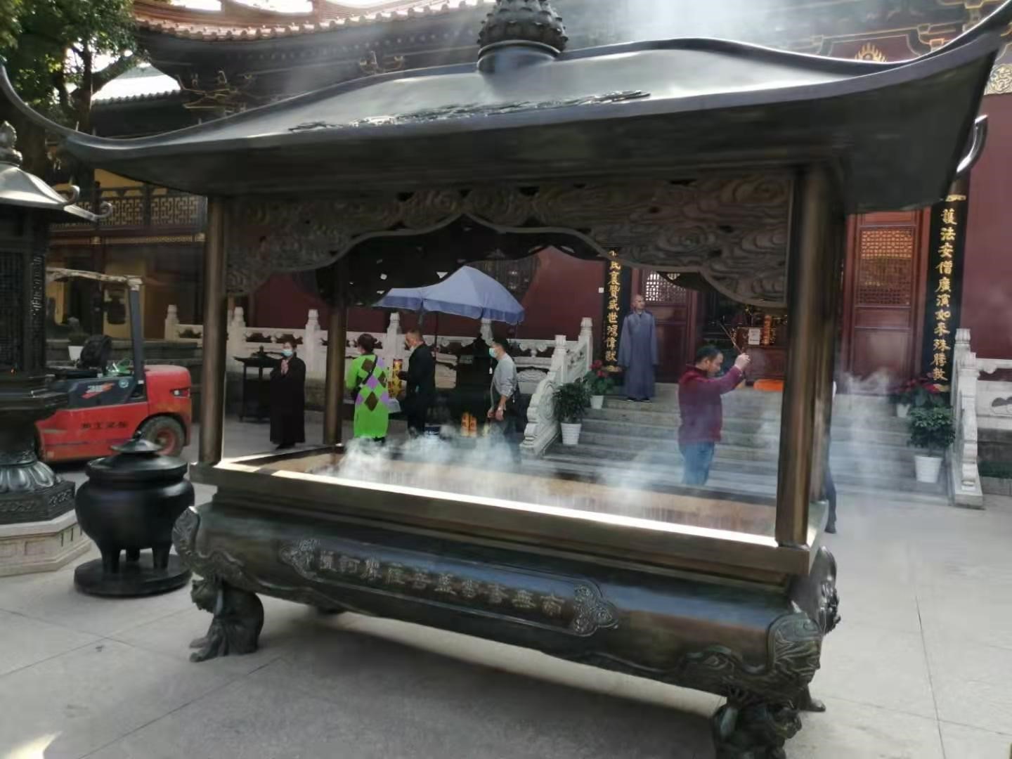 在一片园林式的建筑与自然风光中,却又处处透露出佛教寺庙的浓重气息。山门前镌刻着南無阿弥陀佛字样的大型石照壁;山门两侧巨人般屹立的,是目露凶光的泥塑门神;天王殿与大雄宝殿廊柱上充满禅意的楹联;在阵阵诵经声中,大殿内盘坐在宝座上的高大的菩萨金身,正目露慈悲俯视着芸芸众生;摆放在广场中供香客集中上香的长方体大香炉上空,香烟氤氲,空气中弥漫着一股股典雅的檀香木香味;在如织的人流中,不时出现身着僧衣迈着轻盈步履,匆匆而过的僧人们的身影……,这一切都在提醒着前来的游人,这是一座有着园林之美的真正的和尚庙宇。