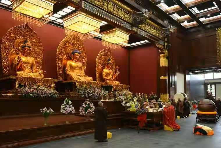 只见整个念佛堂面积约有5、6佰平方米,最高处约10米上下,两边的廊柱除留下廊道以外,大堂中间的垮度宽约20几米。内饰颜色以绛红为主,配以金粉色及绿色点缀其中,整个大堂气势恢宏,美轮美奂。有三尊高高的金身菩萨塑像端坐于大堂正面深处,在朦朦胧胧橙色灯光的照射下,整个大堂氛围庄严而神秘。