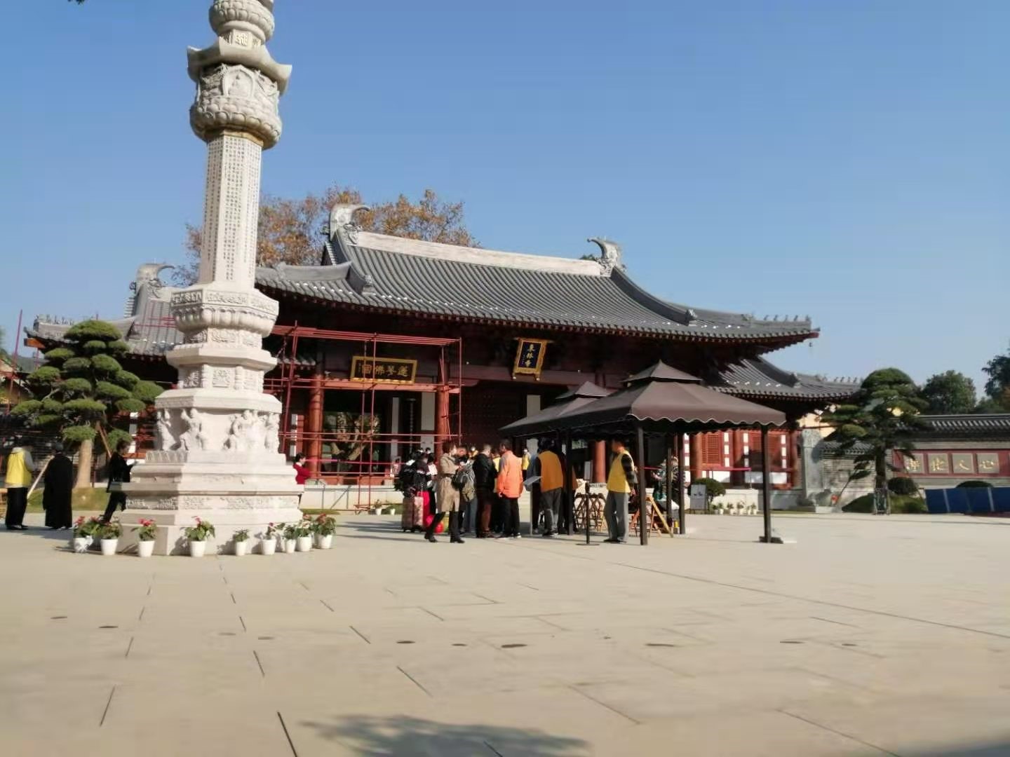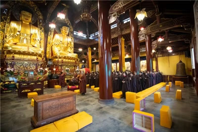 找到青莲堂,我抬脚走进,立马有两位义工闪身拦住了我,说这里正在念佛,不能打扰。我跟两位义工护法说,我只是从走廊过去领海青,不会打扰。两位护法见说,便一左一右返回大堂门前,双手合什,作虔诚状。大堂内己传出诵佛声,我走过门厅时顺眼一看 ,顿时惊呆。