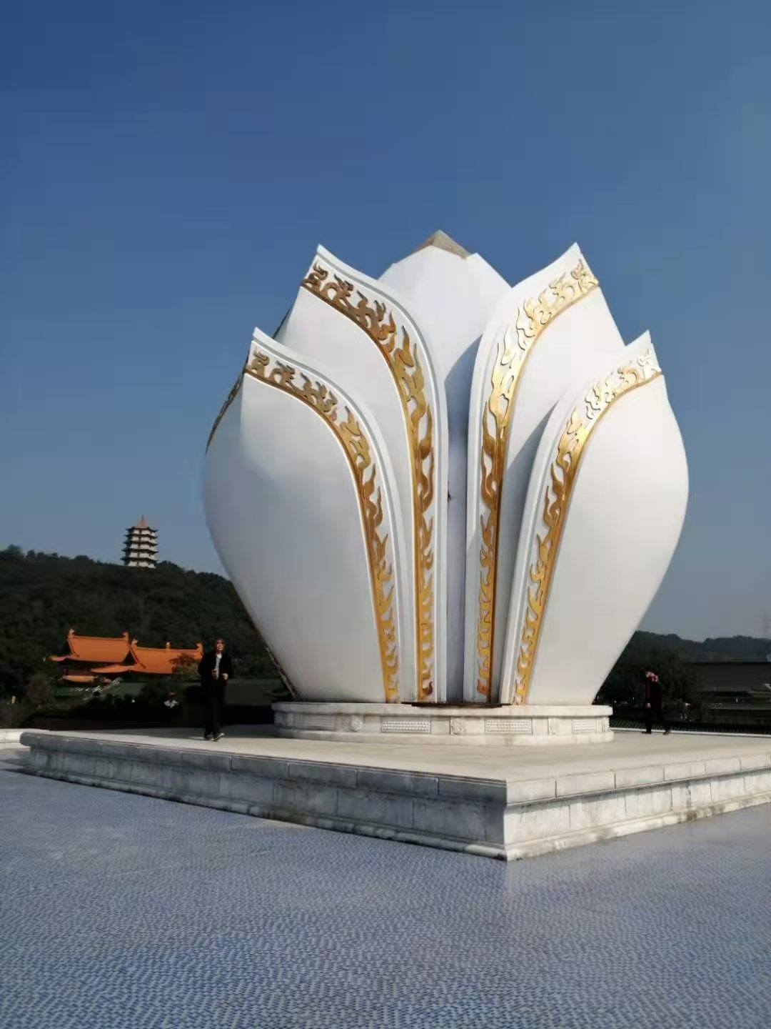 东林寺地处庐山西麓,背靠延绵起伏的小山包,草木葳蕤,绿色的丛林中掩映着一座白塔;而与之遥相呼应的,是对面小山岗上一朵雪白圣洁的佛莲雕塑。