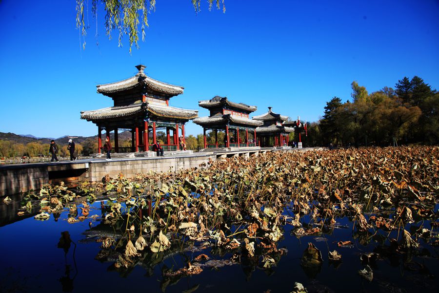 深秋,当我站在水心榭,望着水面上的残荷衰草、落红败柳,心中竟涌起悲凉情愫。这片水域是著名的避暑山庄水心榭,水面上筑有石桥通向湖心,桥上有三座亭榭,两边是银湖和镜湖。记得那年菡萏盛开时节我来到水心榭,老远就闻到了荷的清香。这里的荷花真是好看,“接天莲叶无穷碧,映日荷花别样红”。那亭亭玉立的荷花,像娇羞的少女,微微含笑迎接了我。六年后的今天,我又来到水心榭,看到的却是一派颓废落败的景象,怎不令人陡增惆怅?