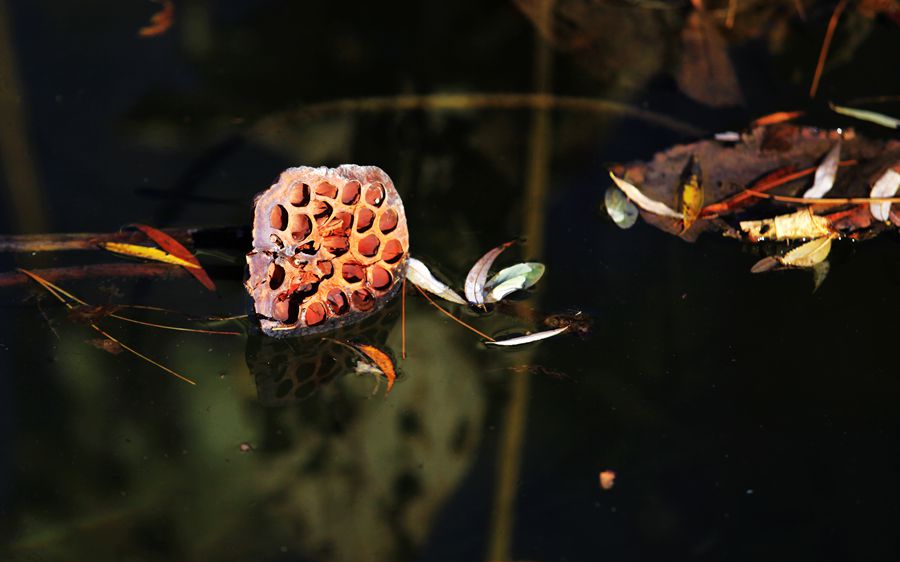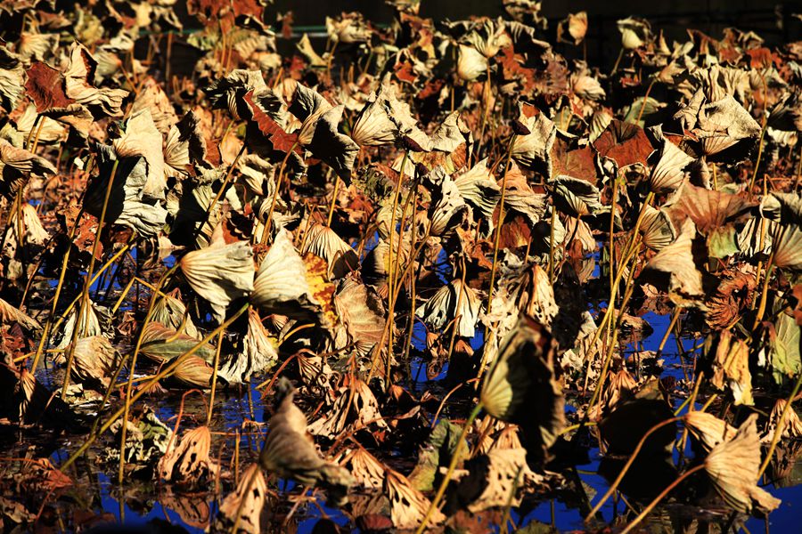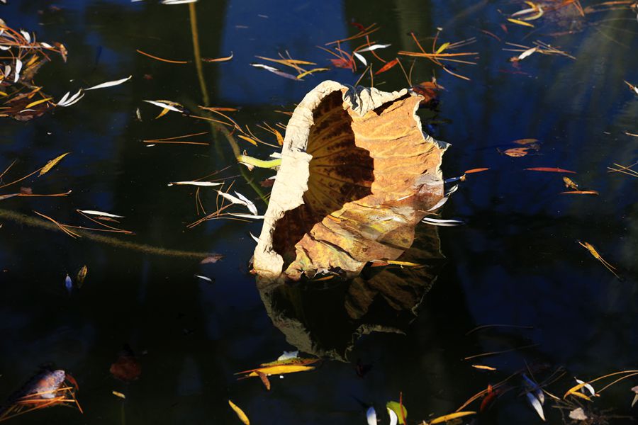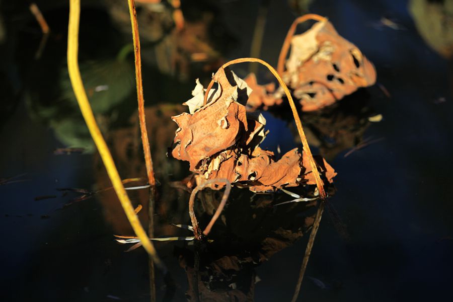 水心榭的残荷,似一幅催泪的图画,有的枯萎,有的折腰,骨瘦清冷,憔悴枯稿,仿佛经历过一场残酷的战斗,到处弥漫着死亡的味道,让人不堪悴看。这满目疮痍,让我触景伤情,心里滋生出凄凉的况味。人生如荷,百年弹指间。当繁华落尽,尘归尘,土归土,生命成为毫无知觉的虚空之后,我们在哪里?岁月流逝,我,独自等待;你,又在哪里?残荷,从繁华走向陨落,在苍茫大地上,留下的只是一个枯萎的身躯,它倒立水中,枯焦卷缩的叶片在风中独舞,负载着无语的前世今生。有谁知道莲的心事?世有解语花,凭谁解花语?