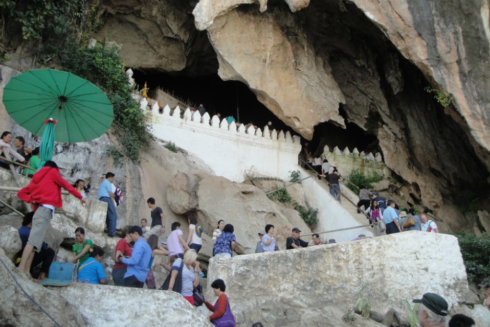 石洞寺人们习惯叫“千佛寺”。位于湄公河与南乌江汇合处、琅勃拉邦以北30公里的南乌河口的石洞寺,乘船沿湄公河逆流而上2个小时左右到达。船靠岸沿石阶上到洞口,在石灰石峭壁位置较低的两个岩洞里摆放着许许多多从周边国家和老挝各地信徒送来的大大小小、年代不一、风格各异的佛像。据导游介绍每年宋干节(即泼水节),琅勃拉邦人都要集资铸造佛像送到这里来,至今已经有近万尊佛像。在这里游人不仅能一览近千万尊形态各异的佛像,透过佛像能清晰地看到琅勃拉邦的悠远历史。