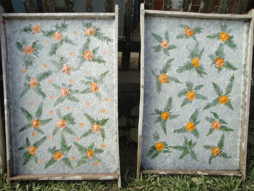 在这些庭院里,你还可以欣赏老挝非物质文化遗产的传统木雕、手工纺织和造纸工艺等等。那一片片植物叶片,艳丽的鲜花瓣,随意地洒在天然纸浆上,晾干竟然神奇地成了一张张嵌在纸里的精美天然图案,或制成明信片,或制成笔记本或制成壁挂等等。此时,我们在欣赏到老挝传统的工艺同时,对老挝人民取之自然的智慧赞叹不已。