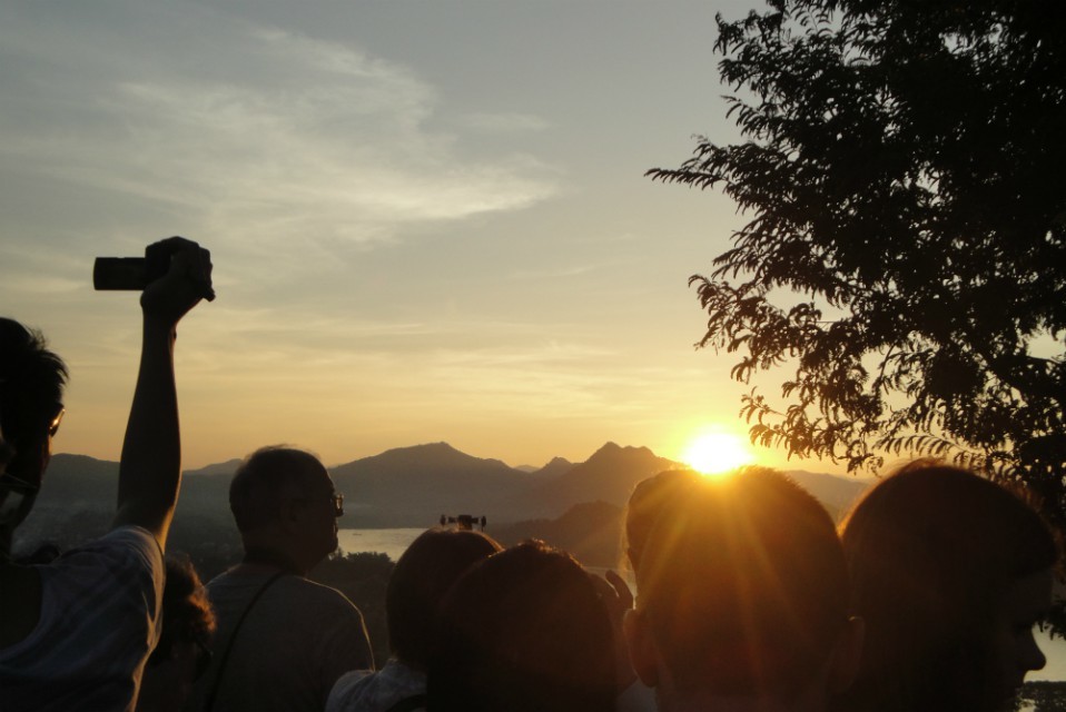 每当夕阳西下,四面八方的游客拾阶而上,登上市区最高峰普西山山顶, 俯瞰风景迷人的琅勃拉邦城全景,欣赏琅勃拉邦的标志性景观——普西日落。尤其是接近日落时分山上的至高点,塔身呈四角形,塔顶犹如含苞待放的莲花 “宗西塔”边,是世界上少有的观日落的绝佳境地。在这里不同国家、不同肤色的人集聚在此,为一个共同的目的,目送夕阳西下。此时的风景异常的美丽,暖暖的余晖锁住所有人的欢笑,形成天上、人间一道美丽的风景。仿佛夕阳也为答谢人们,用琅勃拉邦独有的节奏,缓缓地、缓缓地等待着所有的人,慢悠悠地拍摄到满意的落日景观,才款款落幕,让所有的人带着满意的笑容下山。这时,天才迅速地暗了下来。