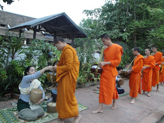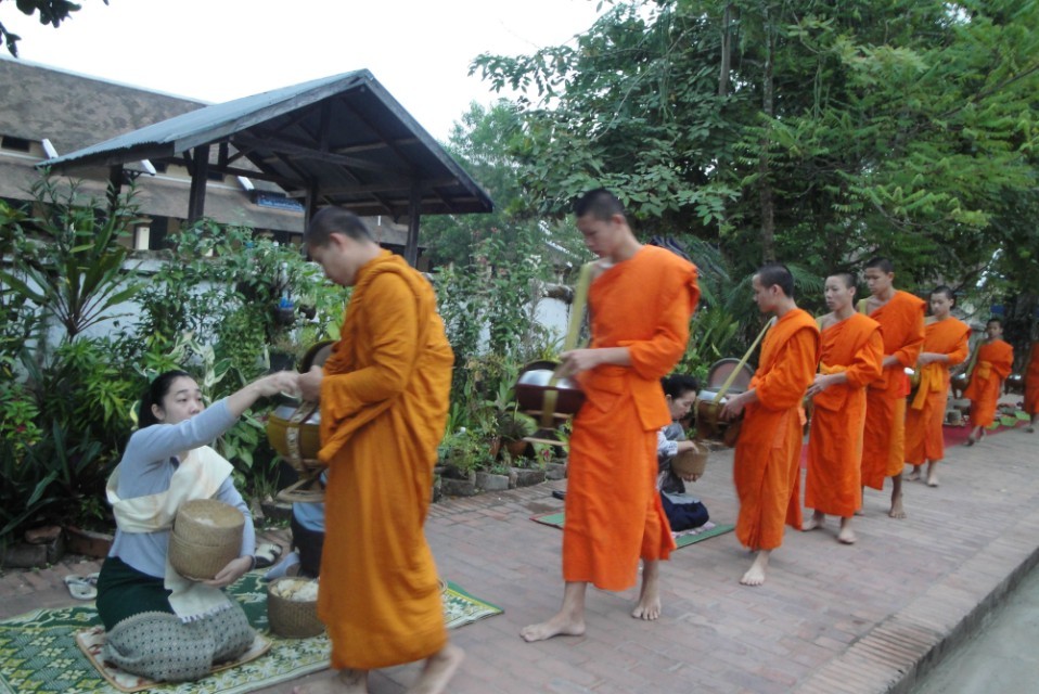 琅勃拉邦有着千年布施的历史,每天清晨僧人赤足沿街化缘是一大景观,一列列身披黄色袈裟僧人走上街头接受信众的布施。布施者安静地跪在地上,虔诚地将糯米饭或者水果放在每一个路过的僧人的钵盆里,直到最后一个僧人走过,布施才算结束。看着布施变成了眼前的镜头,就像从传说走到现实,这种身临其境让我兴奋不已,来不及慢慢体会布施的真谛,来不及逐一行礼,一个劲地往僧人的钵盆里塞上各种食品,一会儿的功夫遗憾地结束了布施。