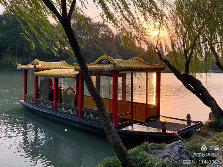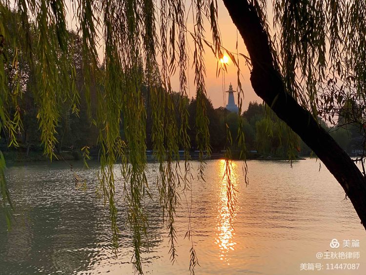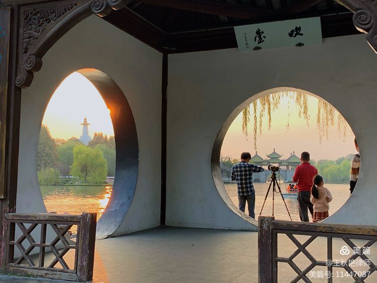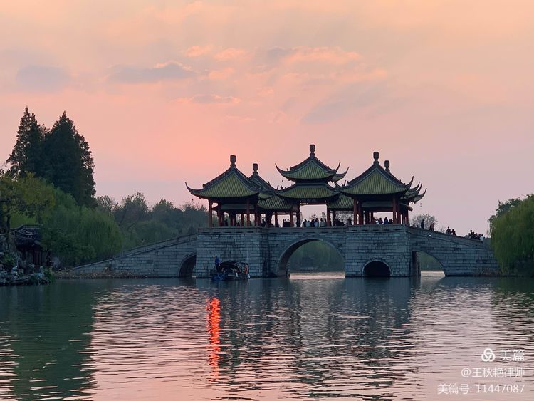 拍到了夕阳下的五亭桥和白塔,夕阳的余晖打在水面上,想起了那句“一道残阳铺水中,半江瑟瑟半江红”的诗句。不同的只是这里是湖水而已。