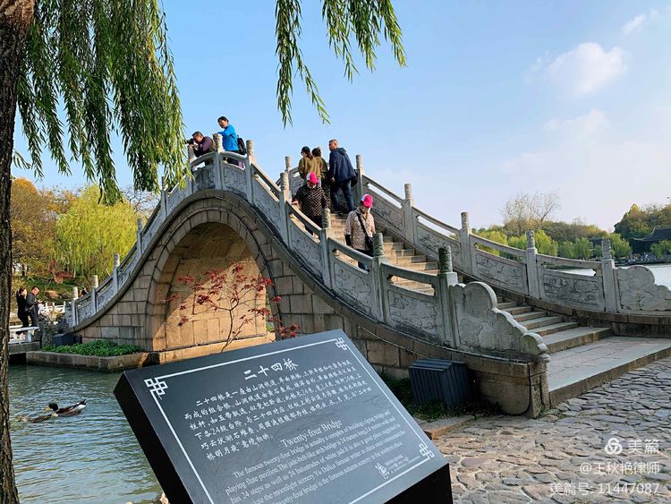 因了这首诗,瘦西湖内有了一个二十四桥景区,由落帆栈道、单孔拱桥、九曲桥及吹萧亭组合而成,中间的玉带状拱桥长24米,宽2.4米,桥上下两侧各有24个台阶,围以24根白玉栏杆和24块栏板。
