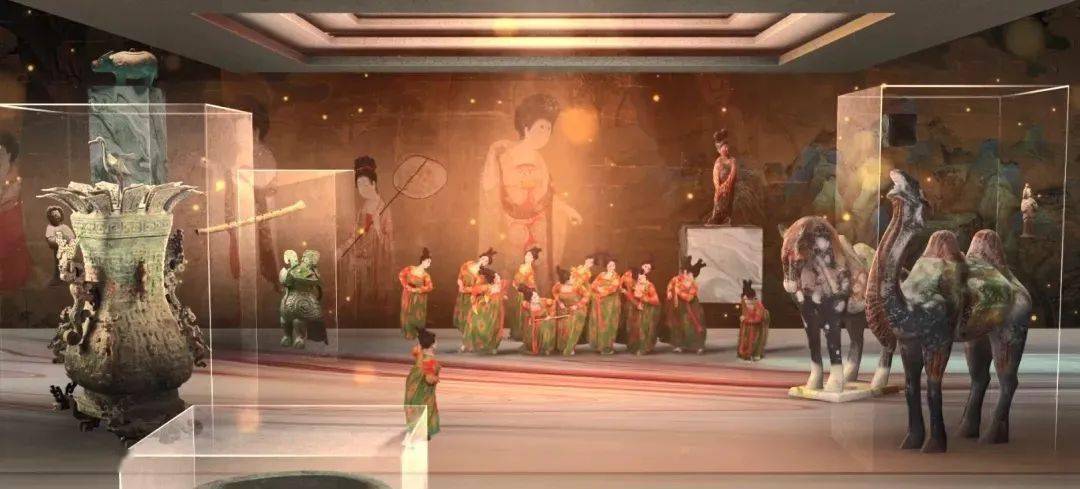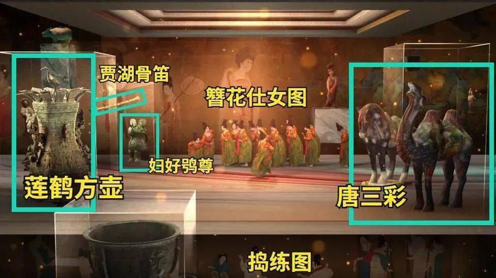 这场美仑梦幻的大唐梦境,除了再现了大唐仕女的形象,舞台上还展示了:妇好鸮尊、莲鹤方壶 、贾湖骨笛、捣练图、簪花仕女图、备骑出行图、千里江山图等国宝