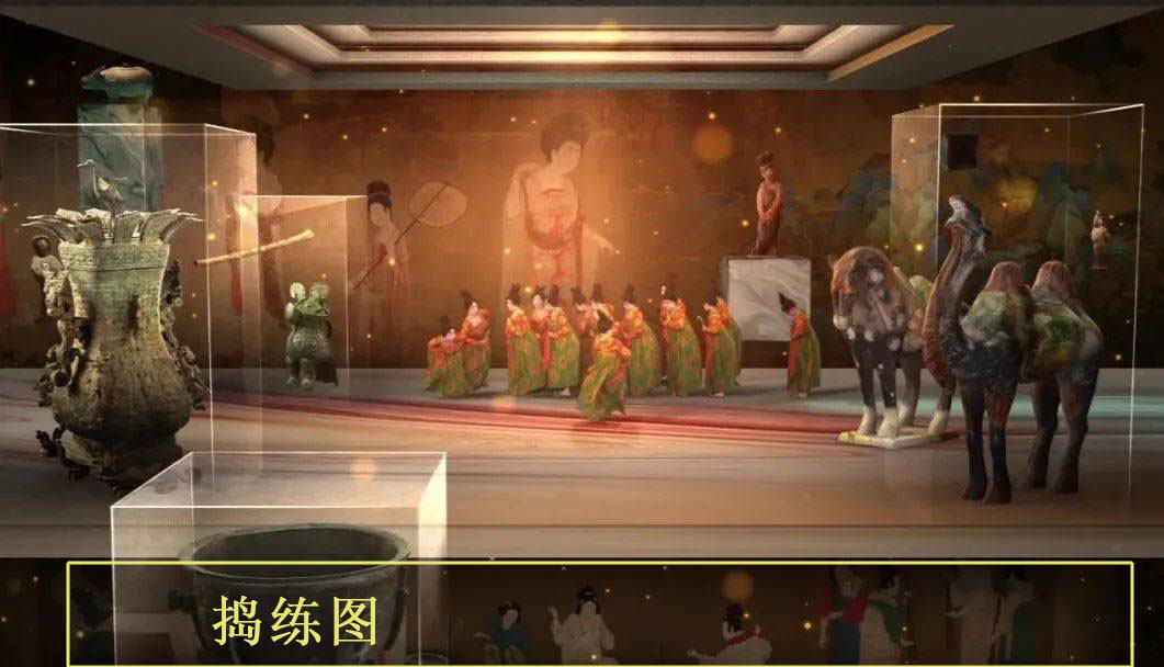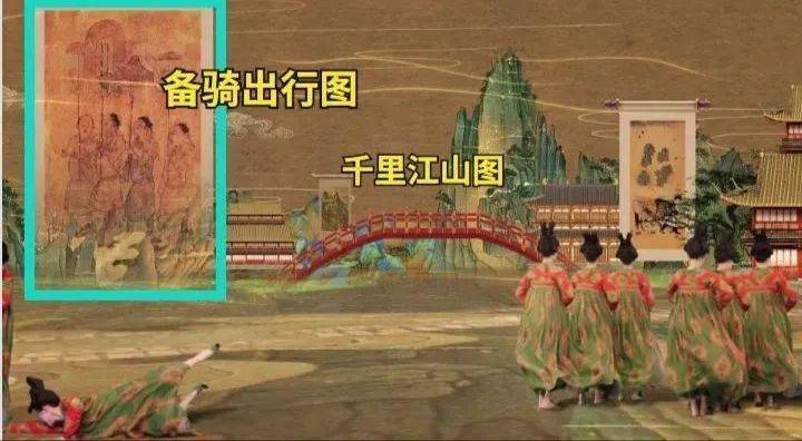 紧接着,随着舞蹈动作的展开,屏幕里出现了三副画卷,右边是《树下美人图》,左边是《备骑出行图》,中间是《侍马图》。