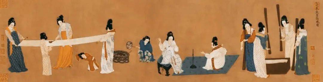 在开场这段银幕下方的一张图是唐朝张萱的《捣练图》。现藏于美国波士顿博物馆。《捣练图》描写宫廷妇女整理丝布的情形。
