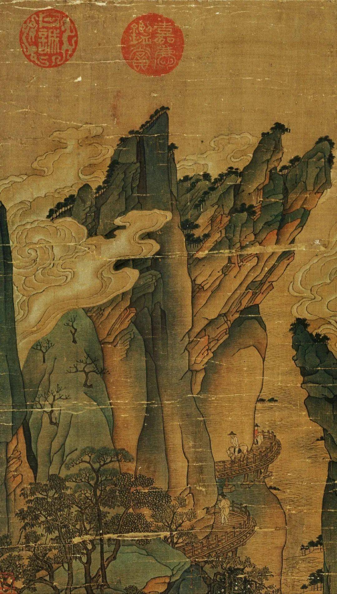 接着一个转场,正前方迎面向观众徐徐而来的是唐朝李思训、李昭道父子的《明皇幸蜀图》,现藏台北故宫博物院。唐明皇就是唐玄宗。在安史之乱的时候,丢弃了首都长安,从陕西经过很危险的一条山路,避难到四川去。四川古称“蜀”,皇帝凌驾到一个地方叫“幸”。这张《明皇幸蜀图》,就是记录唐玄宗避难四川途中的情形。
