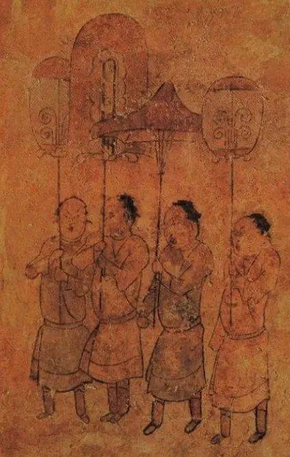 最左边的图,是隋朝的壁画《备骑出行图》、佚名,现藏于山东博物馆。该壁画出土于山东省嘉祥英山徐敏行夫妇墓。徐敏行夫妇墓是于1976年在嘉祥县英山发现的。此壁画绘在墓室四壁与门洞内外。所画人物都用铁线描,平涂颜色。着色以重彩为主,个别处兼施淡彩。《备骑出行图》中四个侍卫像,姿态不同,表情各异,用笔简练劲健,可见其独特风采。