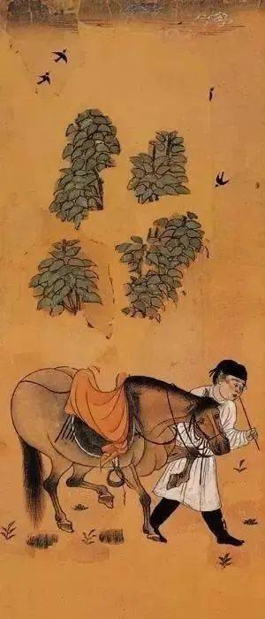 上图正中间的为《侍马图》,佚名,现藏新疆维吾尔自治区博物馆。和右边的《树下美人图》一样,也是新疆吐鲁番阿斯塔那188号墓出土。这是一幅具有浓郁西域风情的侍马图,木框紫绫边牧马屏风上绘有鞍马和侍马人。西域之马与中原之马的确具有不同的特点,在画家的笔下表现得更强健挺拔。
