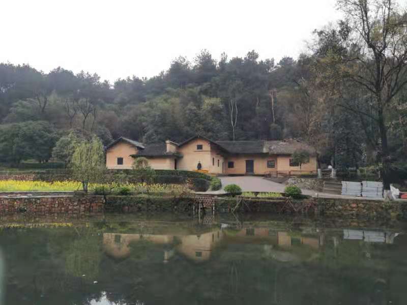 正屋的两侧是厢屋,紧贴着厢屋的旁边,都是一块块小菜园子。紧依起伏的地势,下一个阶梯是一块长条形状的油菜田。油菜花已经全部盛开了,金灿灿的花朵,迎风飘溢着油菜花的芳香。正屋大门的前面,是一块不大的平整场地,有点儿像打谷场的样子。再往前,正对着正屋大门的前面,是一个池塘,沿着池塘的土埂向两边分去,有一条水泥小路。沿着小路再往前走,另一端的小路从两个小池塘的中间穿过去,可以走到小池塘的对岸。从小池塘的对岸,展望毛泽东的故居,房屋背后的山脉,树林浓密,郁郁葱葱。池塘里,山脉和房屋的倒影映照在池塘里,像一幅优美的中国水墨画卷。有山,有水,有房屋,有倒影。恬静,优雅,美丽极了。